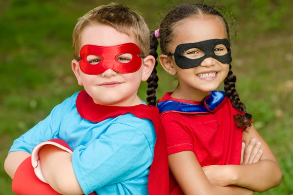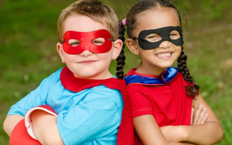Escolha uma cor e vista toda a criança com ela: camiseta, calça ou bermuda. Faça uma máscara de feltro da mesma cor e crie, também com o feltro, um elemento de super herói, como estrelas, raios ou coração. Com um pedaço de tecido, faça uma capa da mesma cor e munhequeiras. Prontinho, seu super-herói está pronto para a batalha!