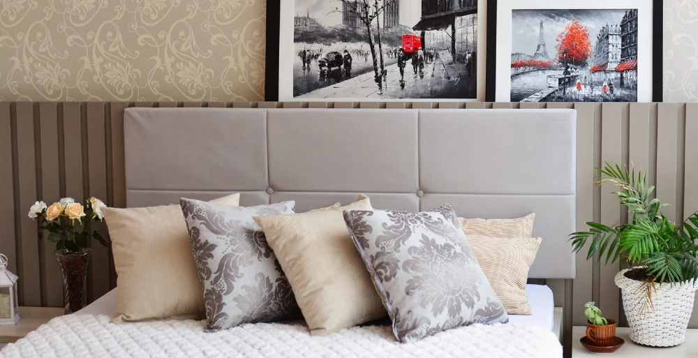 Para deixar o ambiente acolhedor, só uma cama bem confortável não basta – é preciso pensar no todo, no macro do projeto. Por isso, além da iluminação, como já falamos acima, você também pode apostar em uma paleta de cores que seja visualmente aconchegante e em objetos de decoração, como almofadas. Outra dica, é usar cabeceiras de cama estofadas. Neste exemplo de dormitório que trouxemos, reunimos todas essas dicas. Não ficou demais?