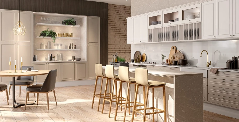 O acabamento do padrão permite que a elegância do mármore esteja presente em diversos ambientes da casa – desde a cozinha, até o home.