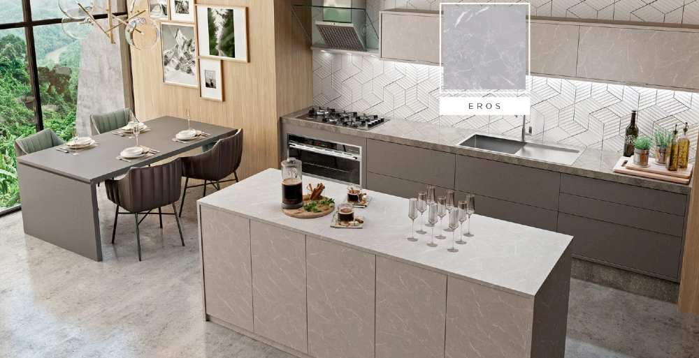 Quer um exemplo? Quando combinados o Eros com o Fendi, o Nebbia e o Gris – padrões de tonalidades mais claras -, o ambiente fica mais clássico e elegante. Outra possibilidade é combinar o Eros com o próprio Cronos e o Field, deixando o ambiente mais contemporâneo. O contraste da pedra com a madeira é equilibrado pela tonalidade neutra do Cronos que, neste contexto, vemos aplicado na cozinha mesmo sendo inspirado em tecido.
